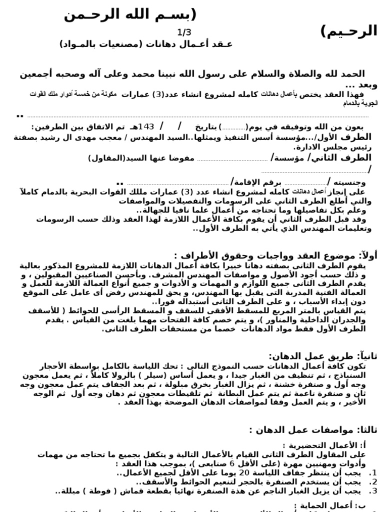 عـقد مقاول أعمال دهانات بالمـواد